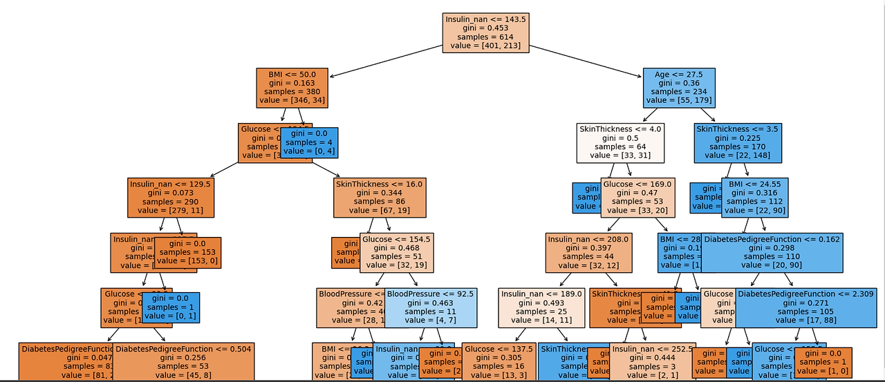여기서 Age, Insulin, 그리고 SkinThickness 같은 항목들은 수치의 범위가 꽤 넓은 편입니다. 이렇게 범위가 넓은 수치형 변수들은 DecisionTreeModel에서 조건이 엄청 세분화 되어 나눠지게 됩니다. (leaf 샘플의 개수가 1개, 2개가 생기는 경우가 발생)