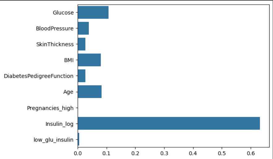 1주차의 그래프랑 비교했을때, Pregnancy의 중요도 보다 Pregnancies_high의 중요도(가장 아래)가 훨씬 낮게 나온것을 볼 수 있습니다. 이번에 학습된 모델에서 Pregnancies_high는 별로 중요한 역할을 하지 않은 걸로 볼 수 있습니다.