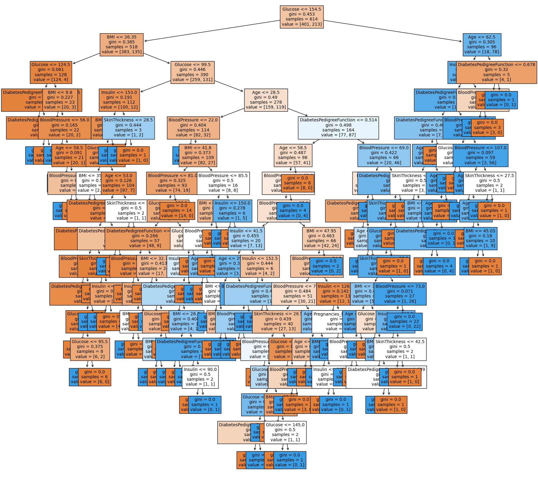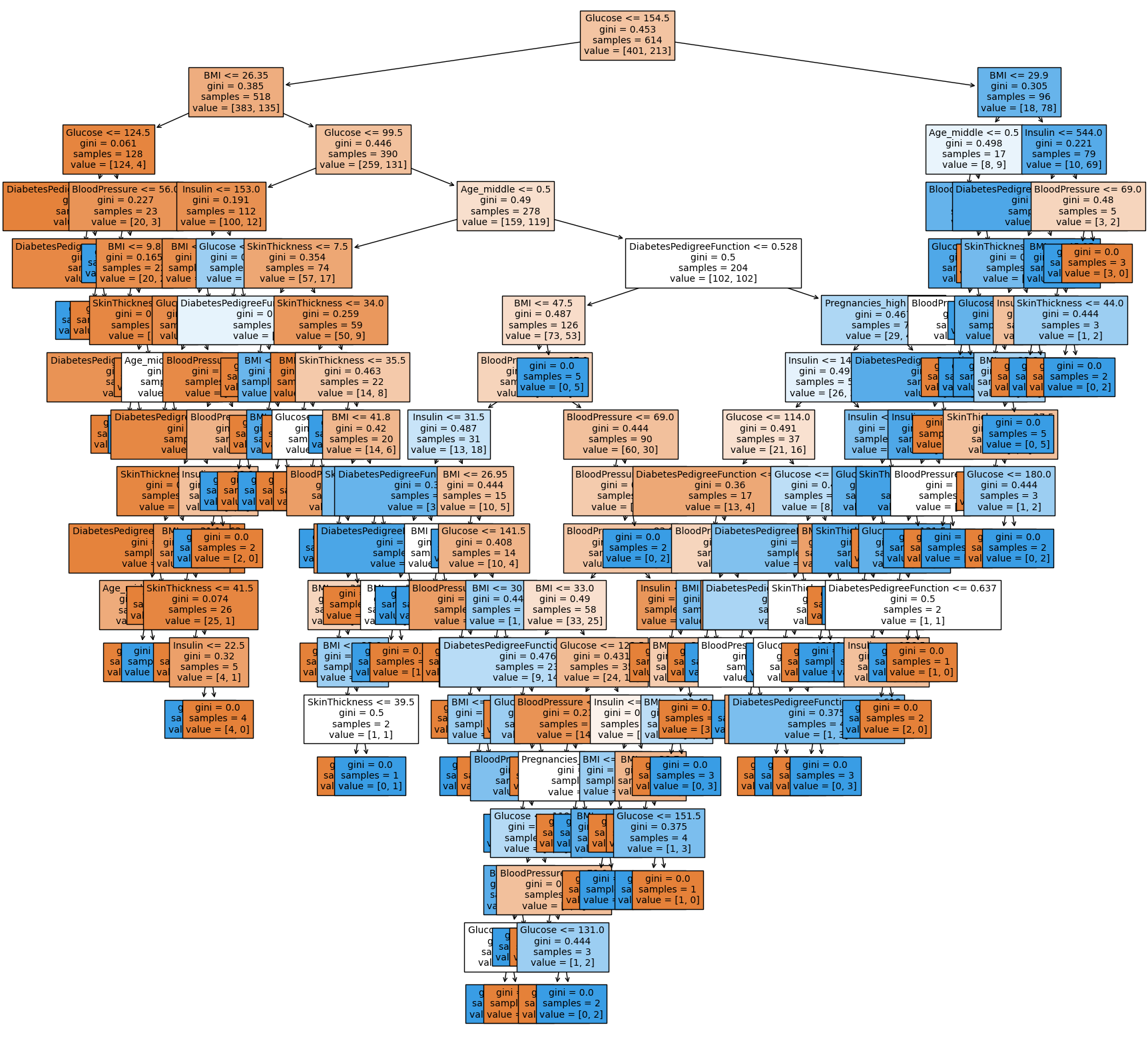1주차 때 시각화 했던 트리와 거의 비슷하게 그려졌습니다. 여전히 Glucose가 첫번째 branch로 가장 중요한 역할을 하고 있는 것을 볼 수 있습니다.