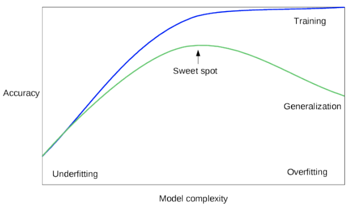 Overfitting은 한국어로 "과적화"라고 불리며 모델이 학습 데이터에 학습을 너무 많이 하여 학습데이터에 대한 정확도는 높지만, 다른 샘플/데이터에 대한 정확도는 오히려 낮아지는 현상입니다.