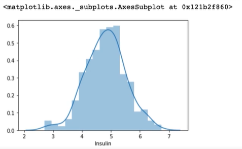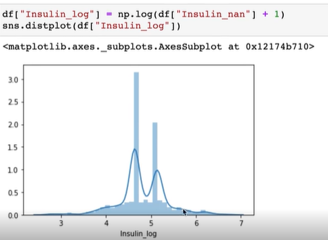 왜도를 낮추기 위한 전처리로, 인슐린값에 log 를 씌워보니 정규 분포 형태가 되었습니다.