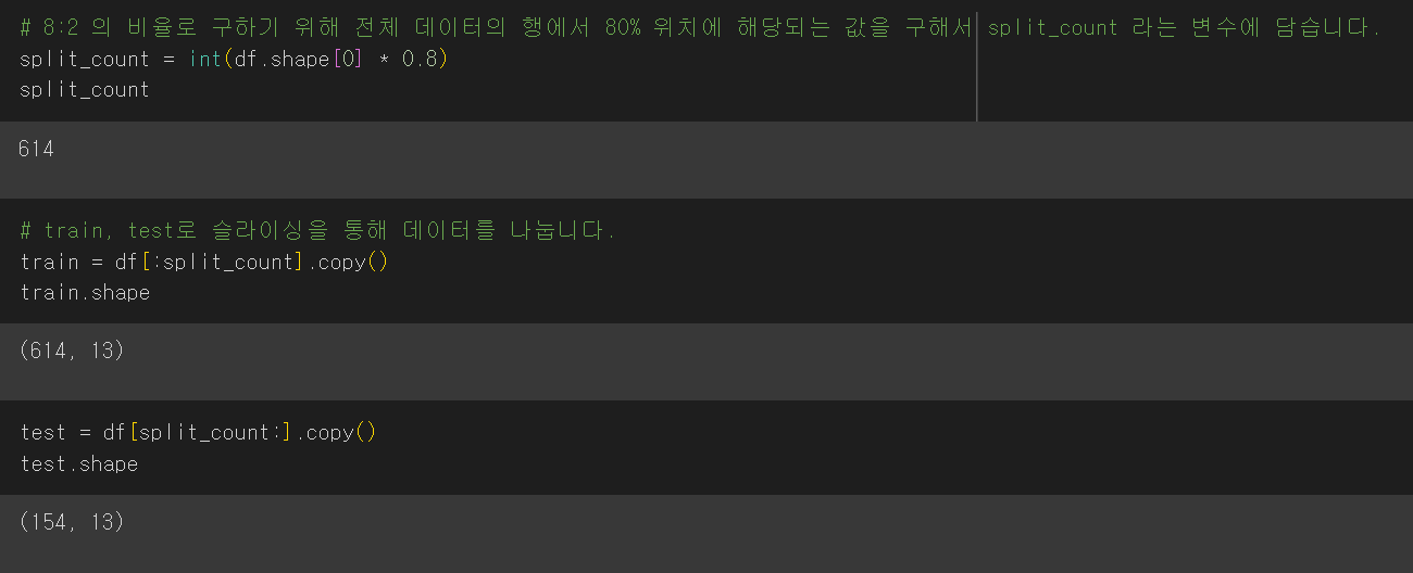 여기서부터 학습, 예측 데이터셋을 실행한 후 예측하는 과정까지 이전(결측치->평균값 대입하기)과 동일합니다.