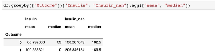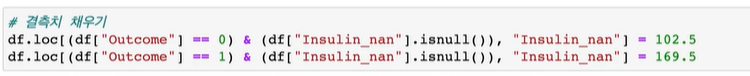 그러나, 이 데이터셋에서는 데이터의 개수도 굉장히 많은 편이었으며, 인슐린 데이터의 거의 절반이 결측치로 되어있어 제거를 해줄 수 있는 상황이 아니므로 결측치를 특정값(평균값, 중앙값)으로 대체하는 방식으로 진행하였습니다.