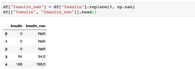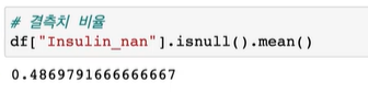 우선 이전과 동일하게 insulin 값을 결측치로 만들어준 후, 결측치 비율을 확인합니다.
