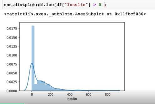 인슐린값만 보기 위해, 0보다 큰 값만을 활용해서 다시 그려보아도 한쪽으로 치우쳐져 있으며 뾰족함을 확인할 수 있습니다.