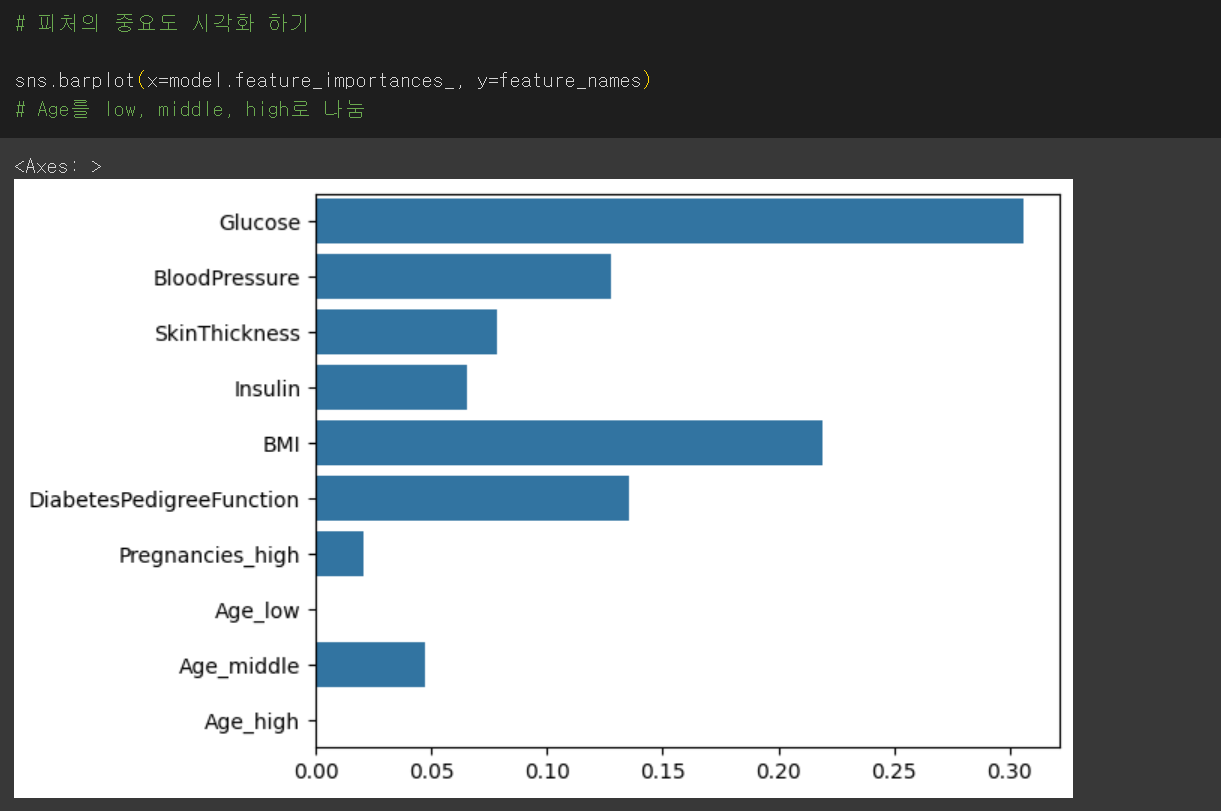 피처의 중요도를 시각화해보니 여전히 인슐린값이 중요한 역할을 하고 있네요.