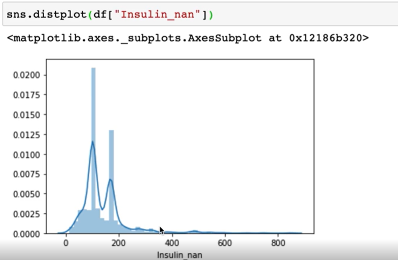 Insulin_nan 을 시각화해보니, 결측치를 중앙값으로 채워주었기 때문에 두 부분에 뾰족한 첨도가 나타나는 것을 볼 수 있습니다. 그리고 여전히 왼쪽에 치우쳐져 있습니다.