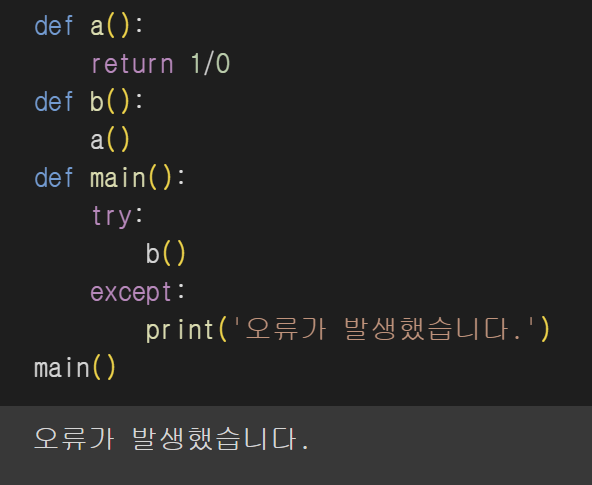 main() 함수가 시작되면 b()함수를 호출하고 b()함수에서 다시 a()함수를 호출하여 1을 0으로 나누기 때문에 오류가 발생하여 ‘오류가 발생했습니다.’라는 메세지를 출력한 것이다.