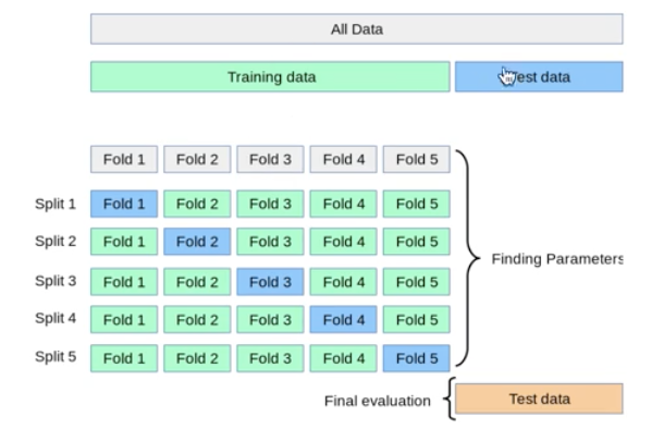 cv는 교차 검증을 위해 데이터를 몇 개의 fold로 나눌지를 결정합니다. 여기서는 5-fold 교차 검증을 사용한다. 데이터 셋을 5개의 조각으로 나누고 각 반복마다 4개의 조각을 train, 1개 조각을 test 데이터로 사용하며 모델을 평가한다는 뜻이다. 이렇게 총 5번의 시행을 통해 모델의 성능을 측정할 수 있다.