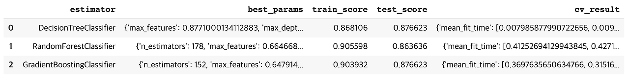 # 결과 리스트에 추정기 클래스 이름, 최적의 하이퍼파라미터, 최고의 교차 검증 점수, 테스트 세트 점수, 교차 검증 결과 저장