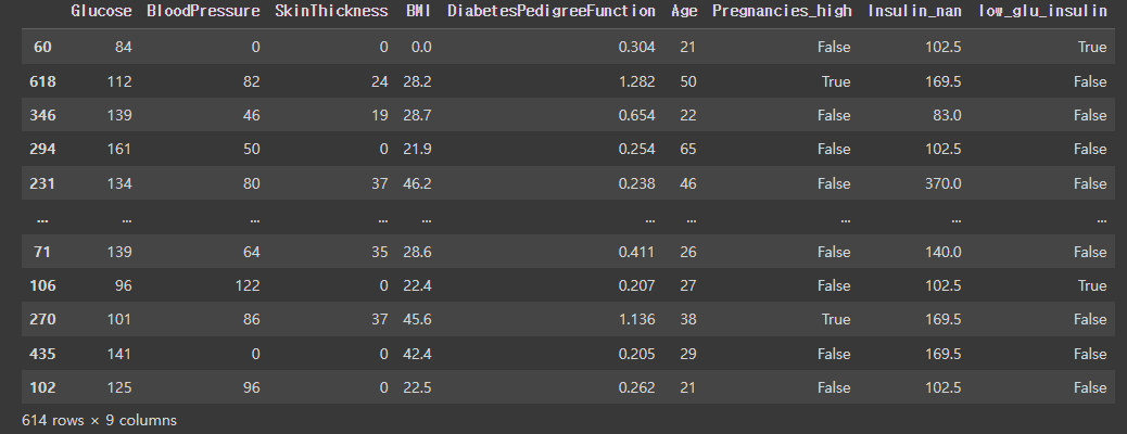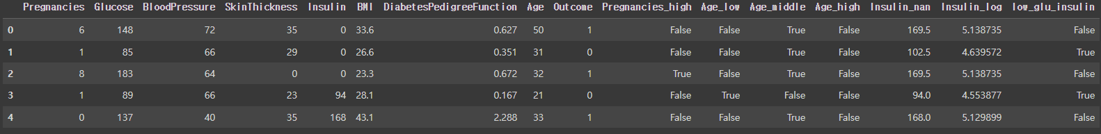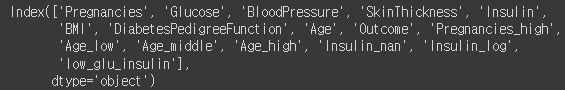 Pregnancies 대신 Pregnancies_high 값을 사용하고, 불필요한 feature를 제거해준다.