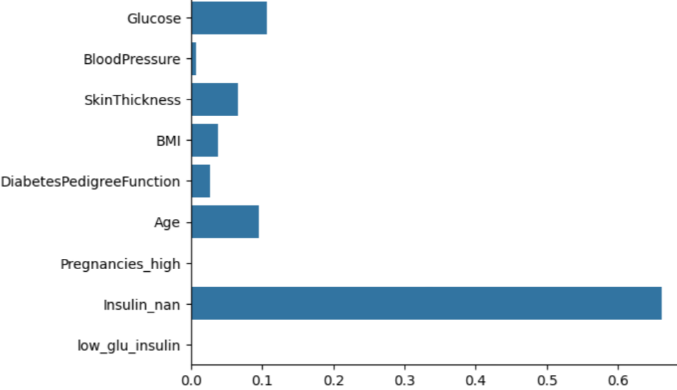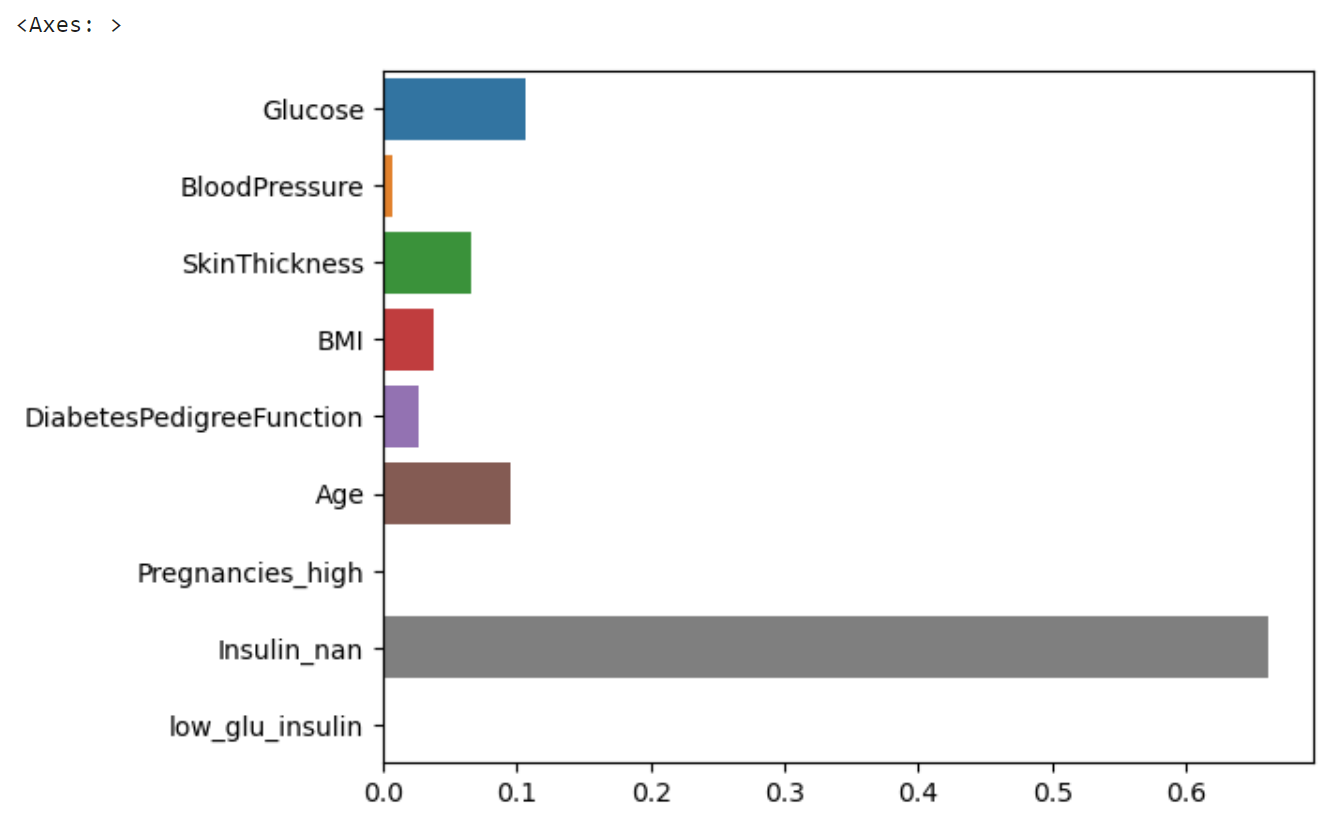 각 요소 별 중요도는 이렇게 나왔고, 이를 bar plot으로 나타내보니, 인슐린이 영향을 많이 미친 것을 알 수 있었다.