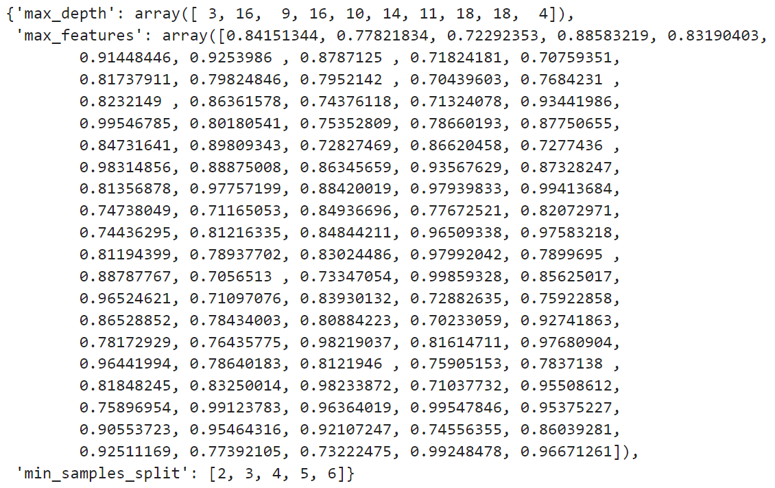 를 입력하여 가장 좋은 최적의 하이퍼 파라미터 조합을 출력할 수 있다. 앞에서 말한 모델에서 랜덤 학습한 값중에 가장 좋은 성능을 내는 하이퍼 파라미터 값이 딕셔너리 형태로 나온다는 것이다.
