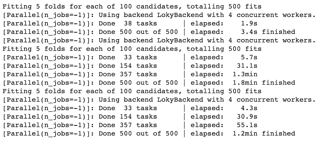 - n_jobs: 병렬 실행을 위한 작업 수이다. -1로 설정하면 컴퓨터 내 모든 자원들을 사용하여 돌릴 수 있다.