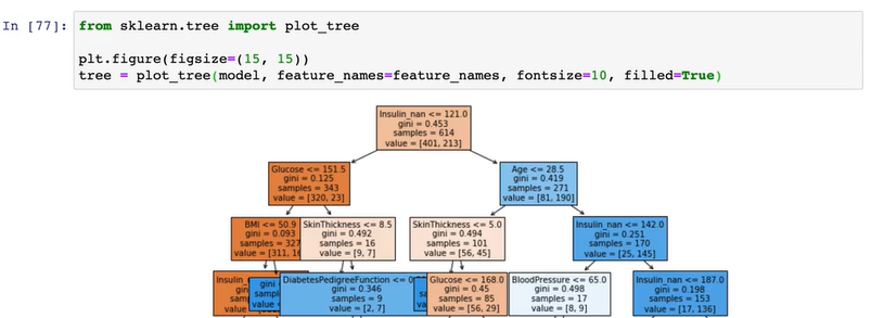 다음 그림은 sklearn.tree에서 plot_tree를 불러와서 feature_names도 정의해주고 색깔도 넣어준 트리이다.