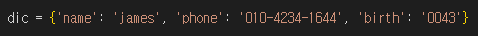 name, phone, birth가 key이고 james, 010-4234-1644, 0043이 vlaue이다.