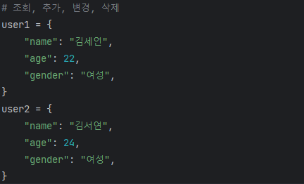 # 연관성 있는 데이터끼리는 딕셔너리에 잘 응집시켜서 관리한다.