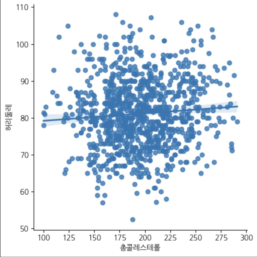 lmplot 그래프만 봤을 때, 체중이 증가함에 따라 총콜레스테롤 수치가 증가하는 경향이 약간 있지만, 전체적으로 보면 명확한 상관관계는 보이지 않는다.