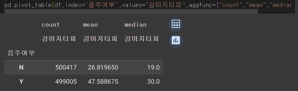 => 차이점) groupby는 데이터를 그룹으로 나누어 각 그룹에 대해 집계연산을 수행하여 출력결과가 시리즈나 데이터프레임 형태로 반환되는 반면 pivot_table은 데이터를 재구조화하여 요약 테이블의 데이터프레임으로 반환됩니다.