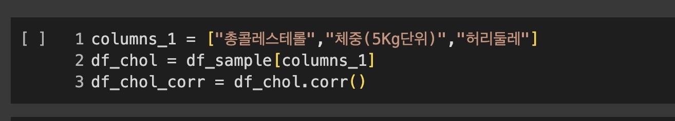 우선 총콜레스테롤, 체중, 허리둘레에 대해서 따로 데이터프레임을 만든다.