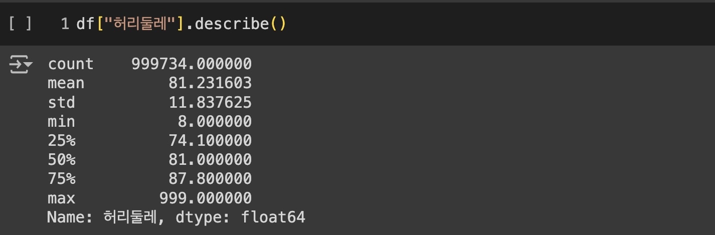 여기서 1.5*IQR은 (87.8 - 74.1)*1.5 = 20.55 임. 이를 통해 허리둘레 데이터의 범위를 53.55 ~ 108.35로 제한하였다.