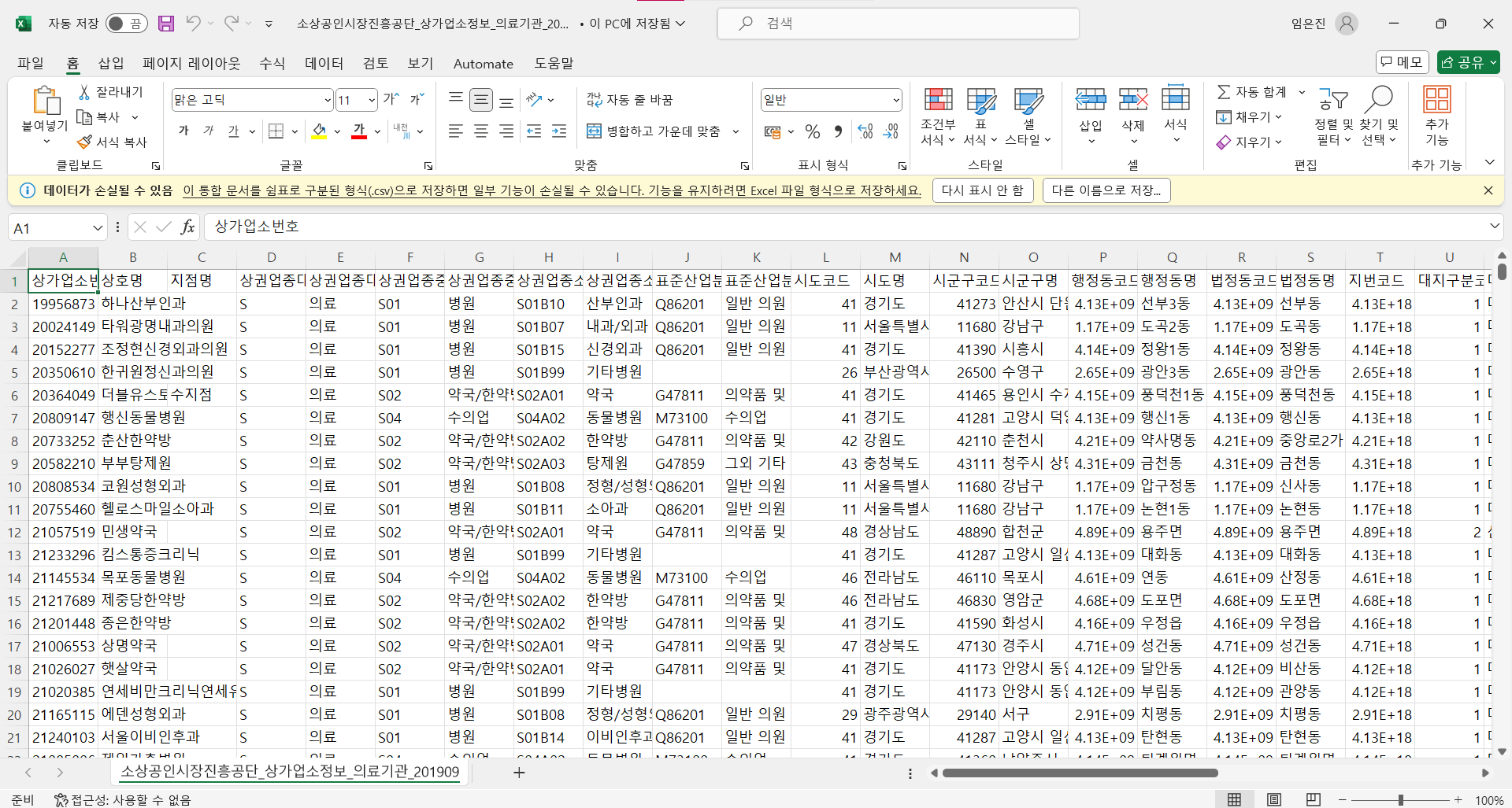 이용한 데이터: 국가중점데이터인 <상권정보 상가(상권)정보_의료기관_201909>