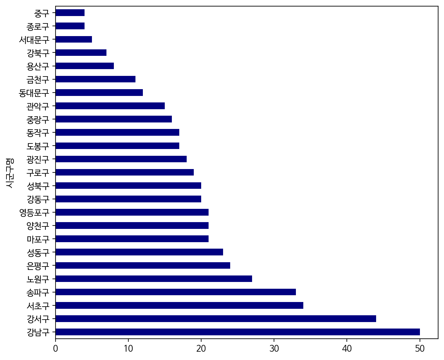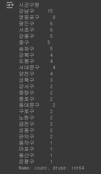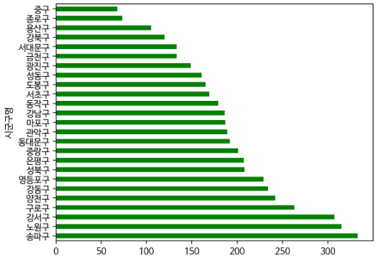 아래는 value_counts를 이용해서 서울 구별 종합 병원분포를 시각화한 것이다.