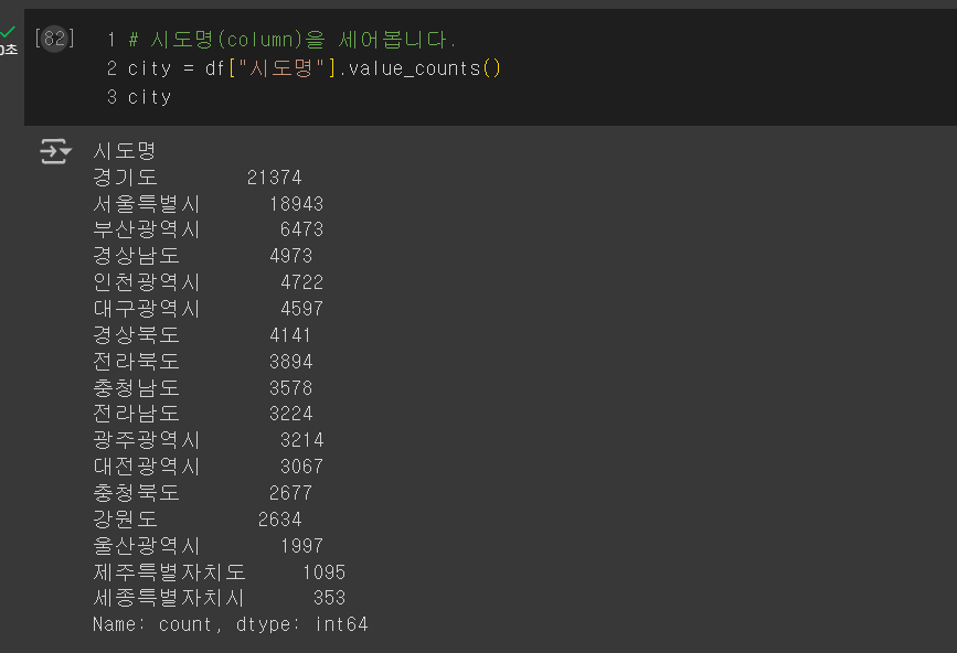 value_counts 를 사용하면 카테고리 형태의 데이터 갯수를 세어볼 수 있으며,