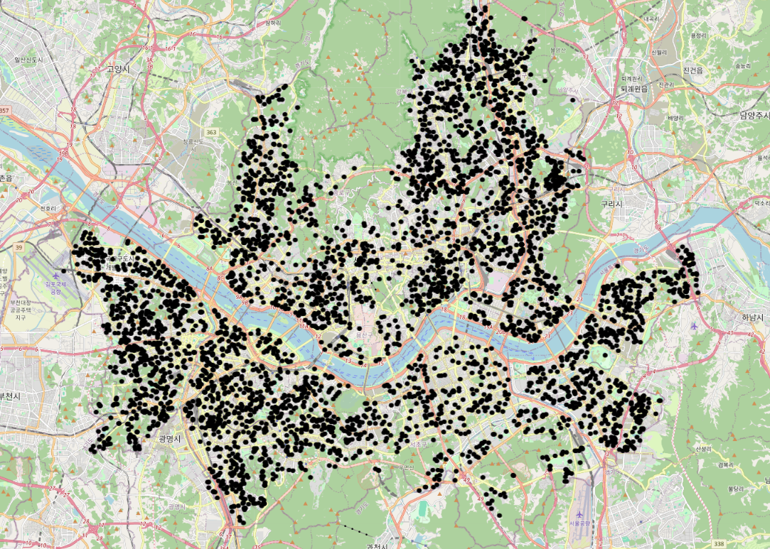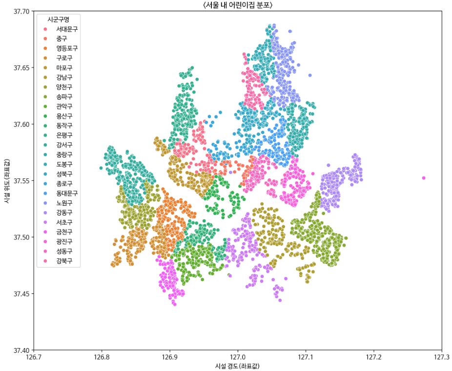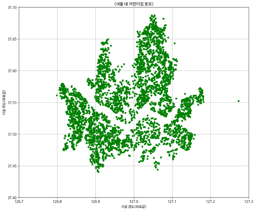 - 소아과와 어린이집 분포를 직접 시각화하지 않아도 비슷하게 위치해 있다는 것을 어느정도 짐작할 수 있기에 완전히