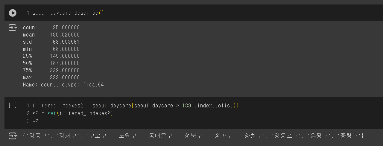 서울 구별 어린이집 개수의 평균은 189.92개였고, 평균보다 어린이집이 많이 분포한 지역은