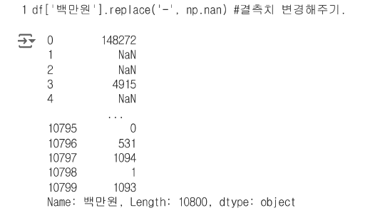 이를 numpy에서 결측치를 뜻하는 NaN으로 바꾸기 위해 replace()함수를 사용하였다.
