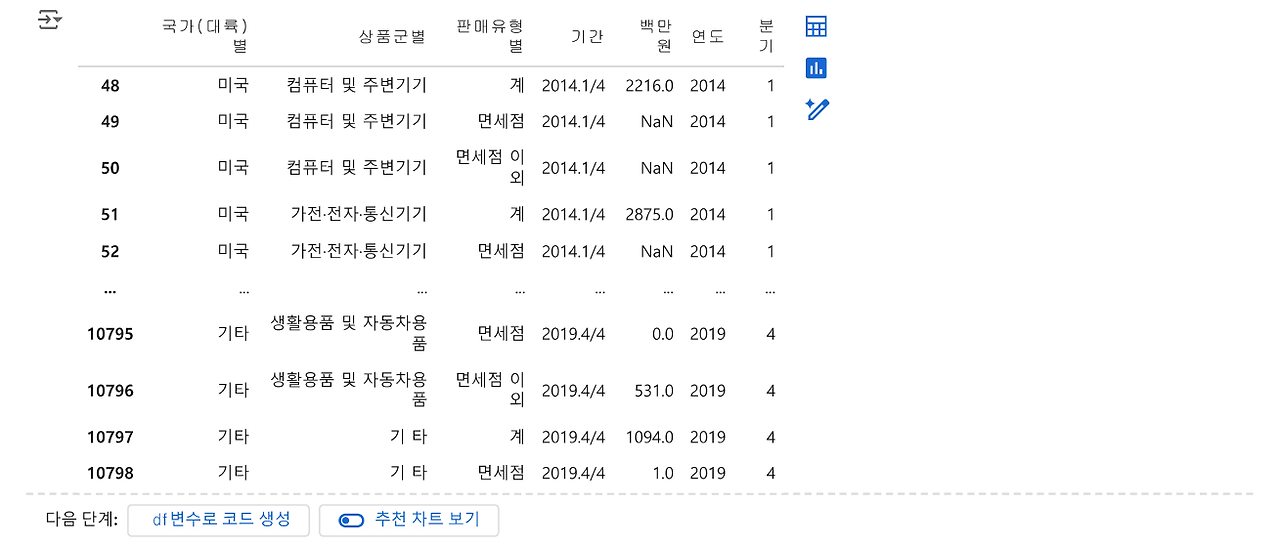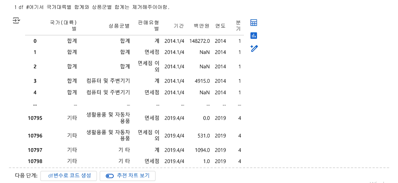 이때 결측치가 있다면 그래프로 시각화 할 때 불편하기에 NaN이 포함된 row를 제거해준다. (즉 판매유형별 column에서 '계'만 남겨두는 것)