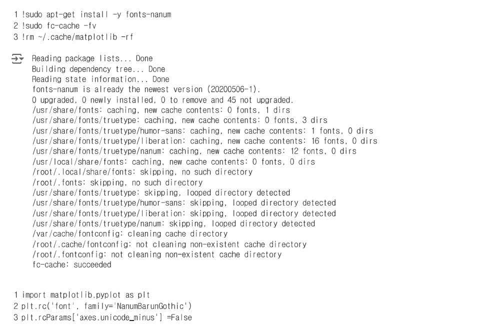 matplotlib와 seaborn 라이브러리는 한글 폰트를 설정해주지 않는다면 그래프가 정상적으로 그려지지 않기에