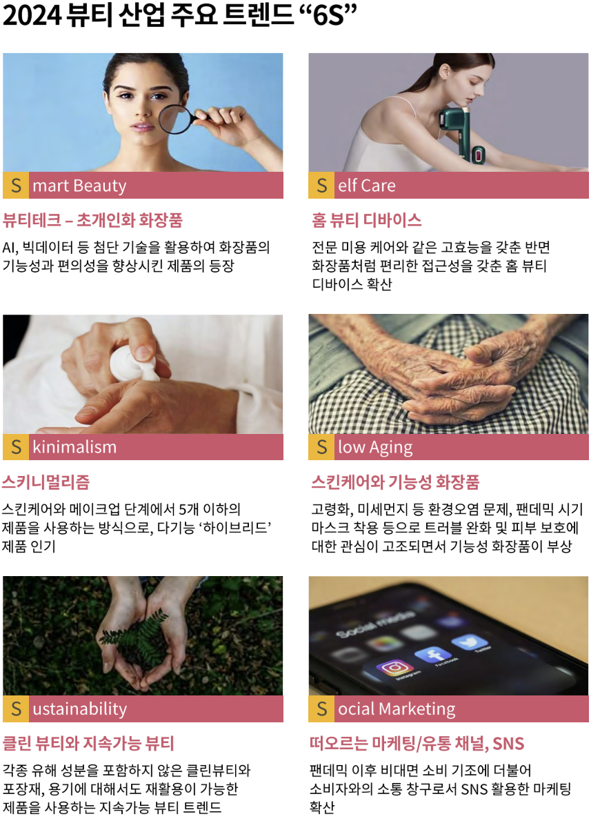 삼일pwC경영연구원들이 현재 2024 뷰티 산업 주요 트렌드로 발표한 6가지는 이와 같다.