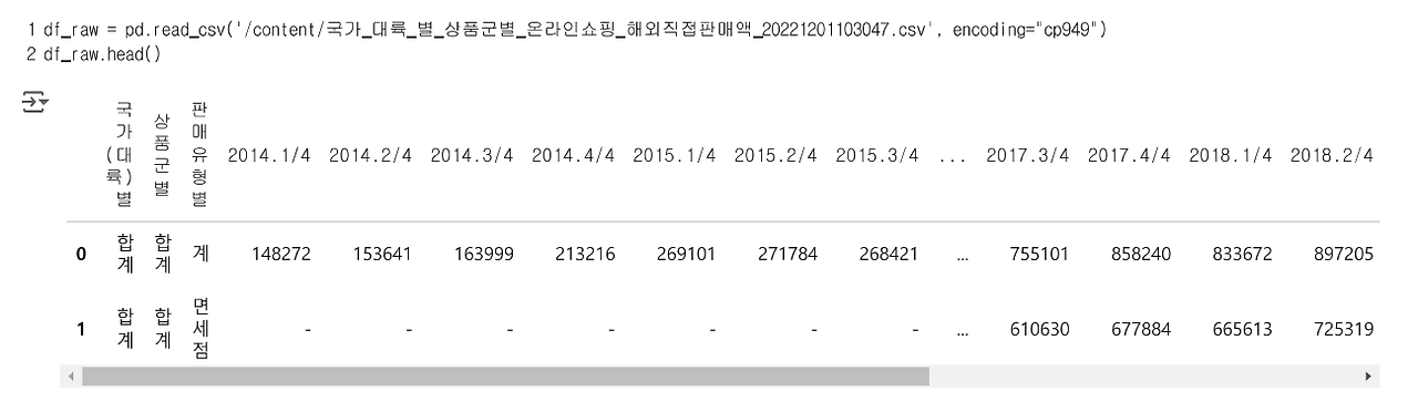 우선 KOSIS 홈페이지에서 국가(대륙)별/상품군별 온라인쇼핑 해외직접판매액 자료를 다운받은 후