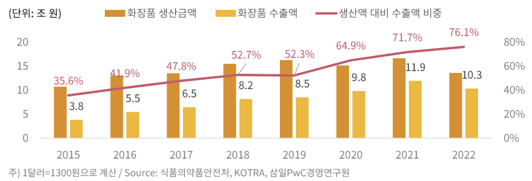 삼일 pwC경영연구원이 발표한 "K-Beauty 산업의 변화"라는 보고서에 의하면 중국시장에서 2019년 이후부터 성장률이 둔화되었다고 알 수 있다. 이는 중국 내에서 자국 상품을 긍정적으로 보는 시선과 코로나로 인해 수출이 원활하지 못한 상황이 겹친 결과라고 추측해볼 수 있다.