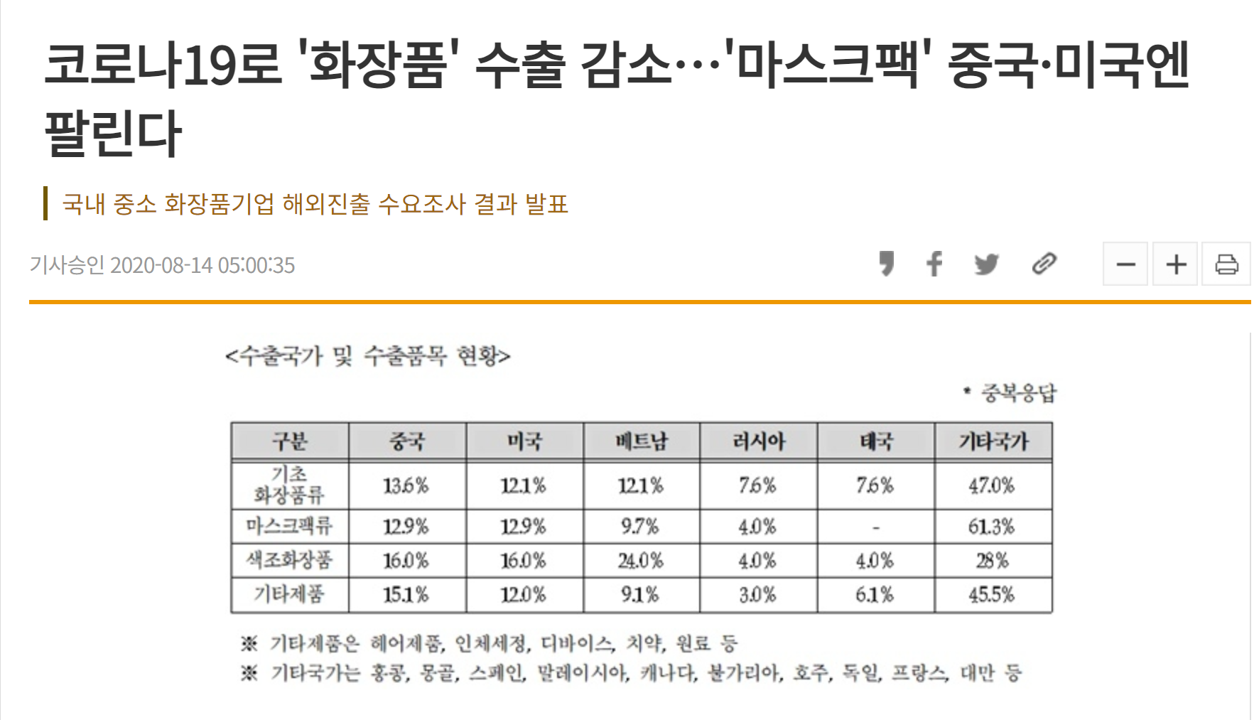 맞다. 14-15년부터 중국이 K-Beauty 화장품에 관심을 갖게 되면서 K-Beauty 상품은 수출중심의산업으로 돌아가게 되었으며 중국 의존도가 몹시 높은 양상을 보이고 있다.