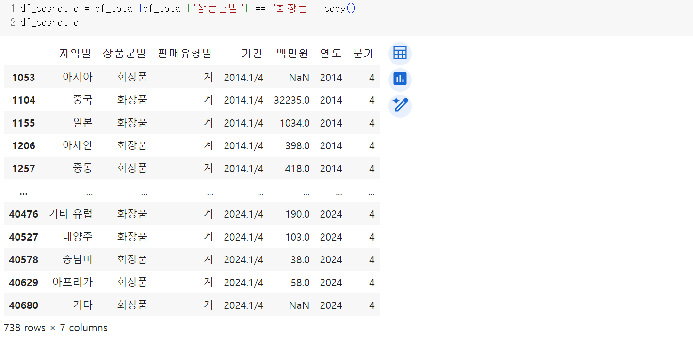 화장품 데이터프레임을 지역별로 출력을 해보겠다.