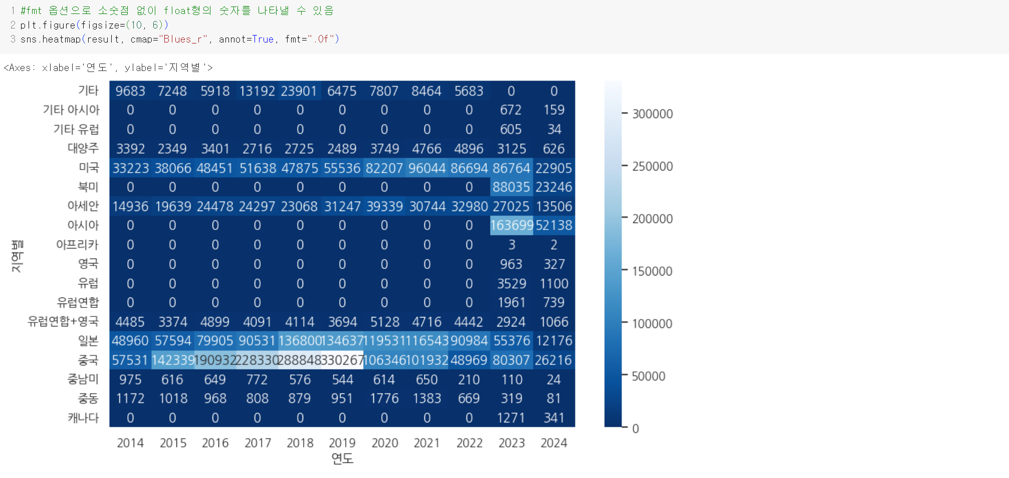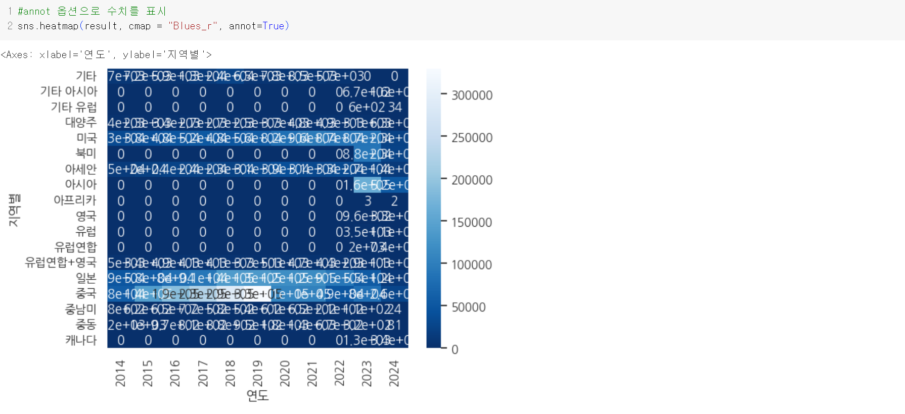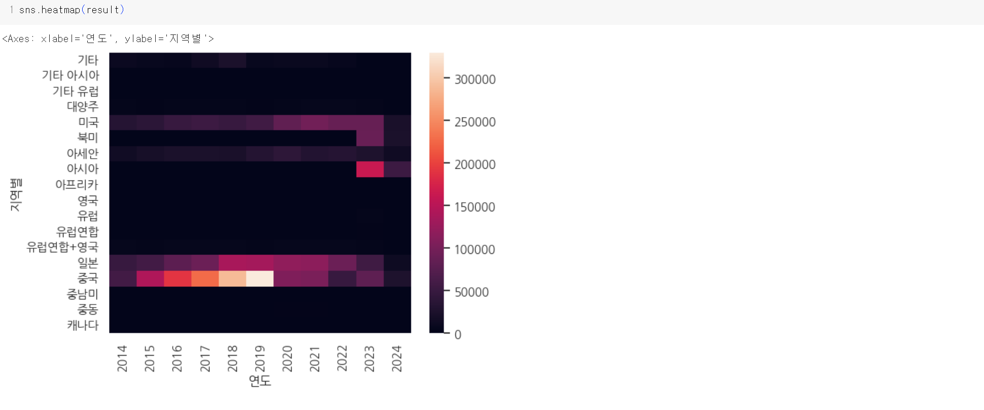 sns.heatmap은 Seaborn 라이브러리에서 제공하는 함수로, 데이터의 값을 색상으로 표현하여 시각적으로 비교할 수 있는 히트맵을 생성한다.