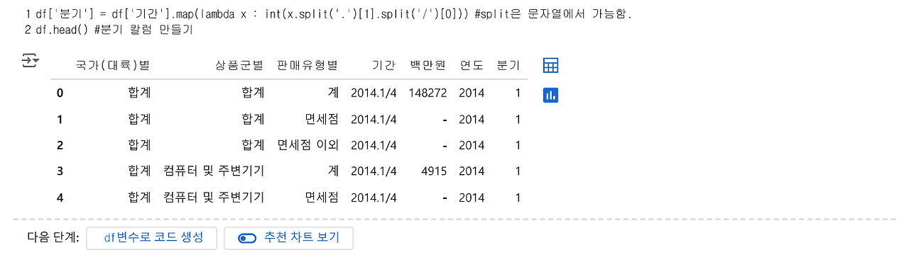 이때 마찬가지로 '분기' column도 생성해주었다.