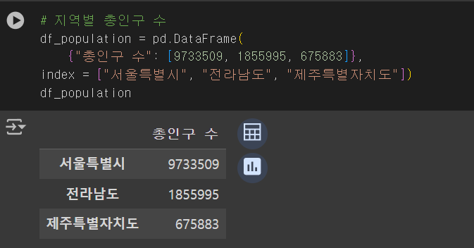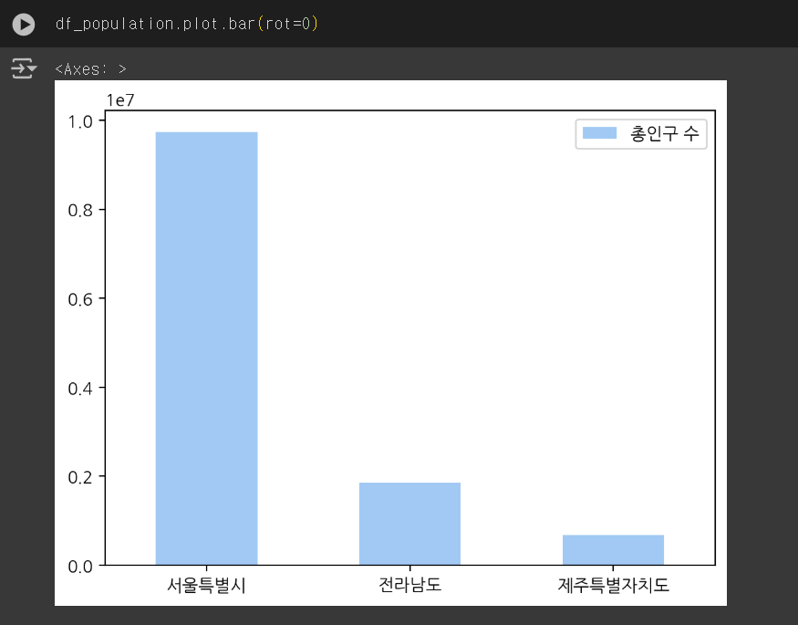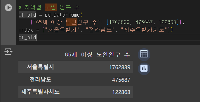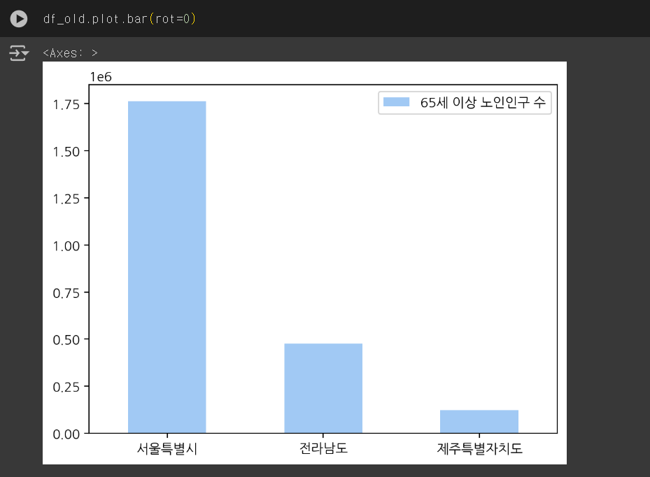 위 시각화된 자료를 봤을 때에는 서울특별시가 전라남도와 제주특별자치도에 비해 총인구와 노인 인구 수 모두 높은 것을 확인해볼 수 있다. 이렇게만 봤을 때는 총인구/노인 인구 대비 병원의 수가 적절히 분포되어있는 것인지는 확인해볼 수 없기 때문에 이번에는 숫자로 비교를 진행해보았다.