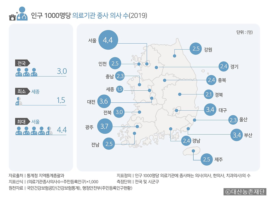 인구 1000명당 서울의 의사 수는 4.4명으로 전국에서 가장 많지만, 경북은 2.1명으로 가장 적다. 이는 지역별 의료 서비스의 질적 차이를 나타낸다. 농어촌 지역은 산부인과, 소아청소년과와 같은 전문 의료기관도 부족하다.