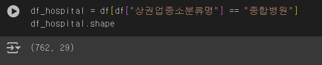 ■ 따라서 전체 데이터에서 상권업종소분류명이 종합병원이고, 시도명이 서울특별시인 데이터만 가져와보자.