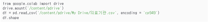 우선, 현재의 종합병원 분포 간 지역 불균형을 좀 더 확실하게 확인해고자 기존의 데이터를 활용해 데이터 시각화를 해보았다. 이를 위해서는 다음과 같은 데이터 전처리 작업이 요구됐다.