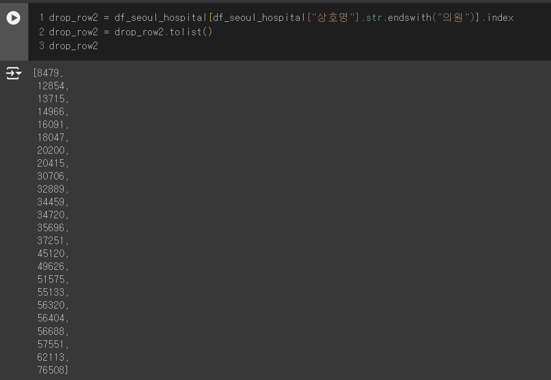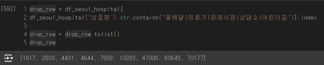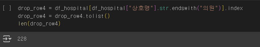 2) df_hospital 데이터 중 상호명에 꽃배달, 의료기, 장례식장, 상담소, 어린이집이 포함되거나, 상호명이 의원으로 끝나는 데이터 제거해주기
