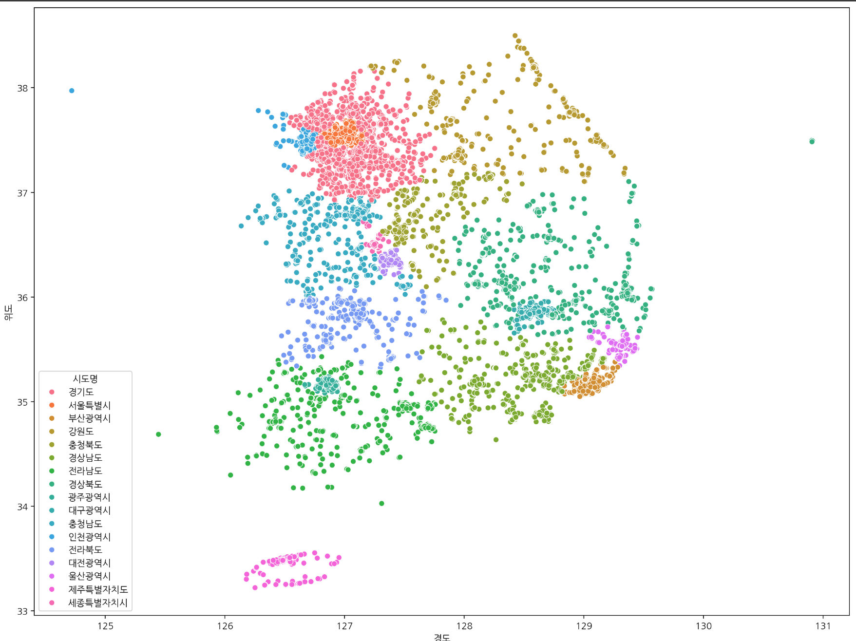 이 scatterplot을 통해서 우리는 이전의 그래프들에서도 확인할 수 있었던 병원의 수도권 쏠림 현상을 다시한번 명확하게 확인할 수 있었고, 병원 분포의 지역불균형에 대한 의문이 들기 시작했다.