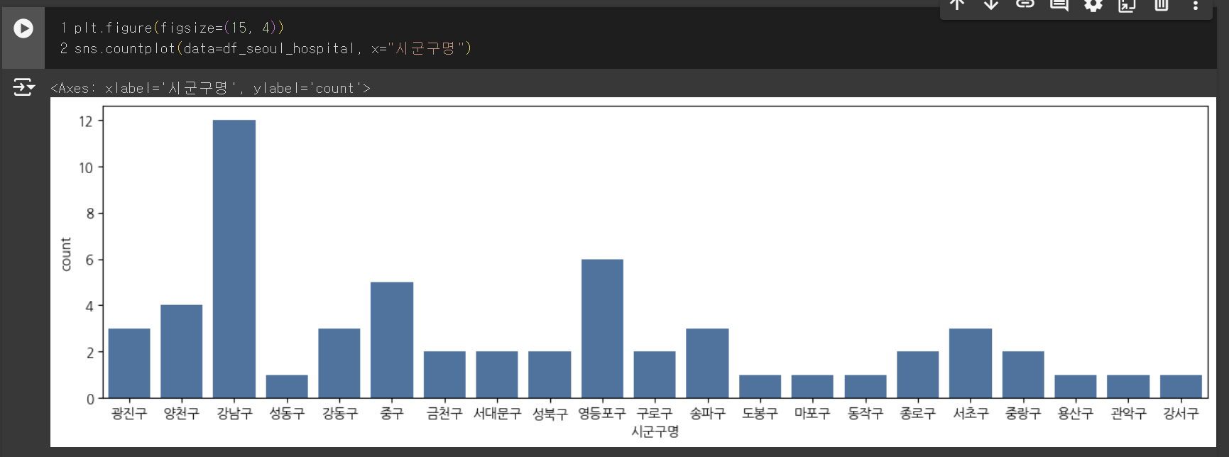 이 바 그래프를 통해서 우리는 서울 중에서도 특히 강남구에 종합병원이 밀집되어있다는 사실을 알 수 있다.