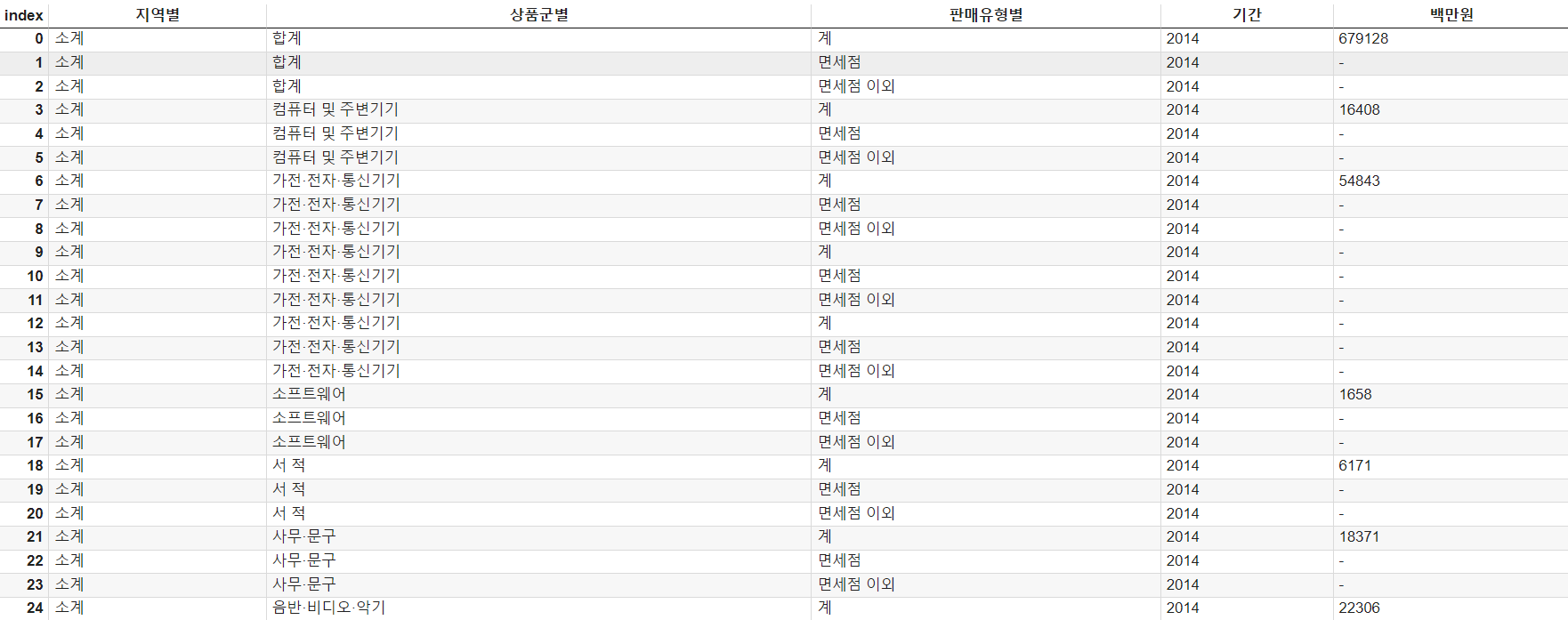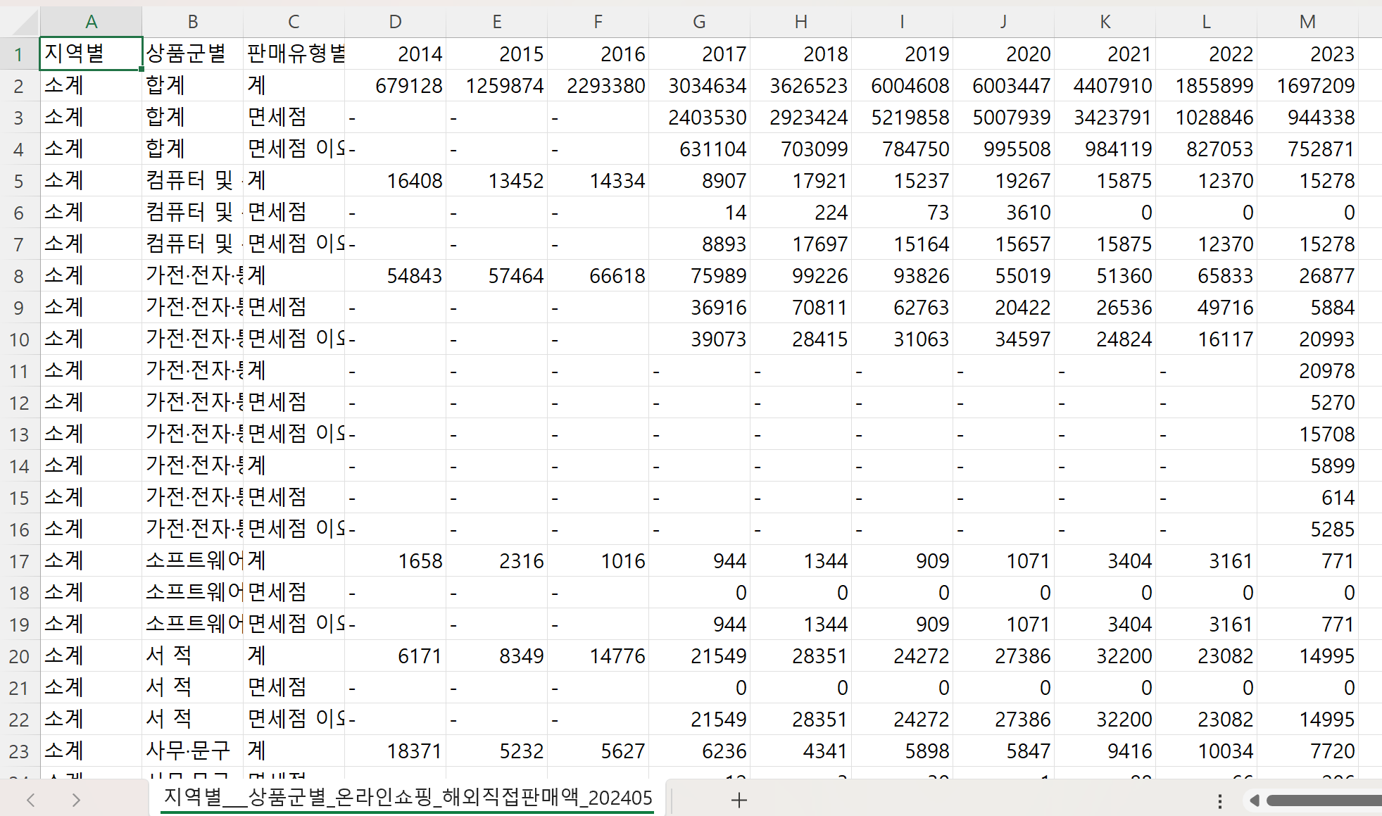 df = pd.read_csv('/content/gdrive/My Drive/지역별___상품군별_온라인쇼핑_해외직접판매액_20240530114255(code).csv', encoding = 'cp949')