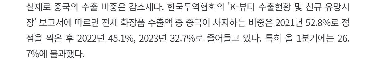 위 그래프를 통해 코로나 이후로 중국에서의 K-beauty 매출이 급격히 감소하는 것을 확인할 수 있다.