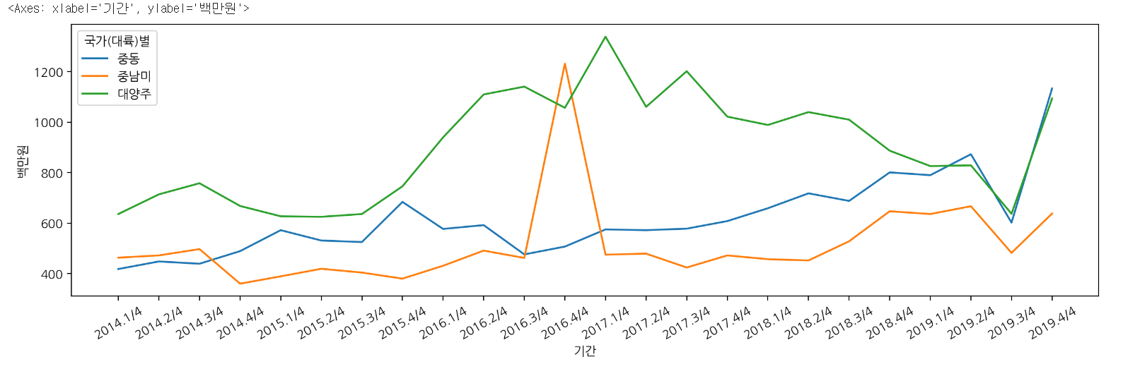 다시 직전 코드에서 중국 일본 미국 아세안의 수치를 제거하여 비교적 작아서 가시성이 떨어지는 수치들을 확인해보았습니다. 중남미를 보시면 2016년 4분기에 매출이 급증한 모습을 확인할 수 있는데 뒤에서 이유를 추측해보겠습니다~